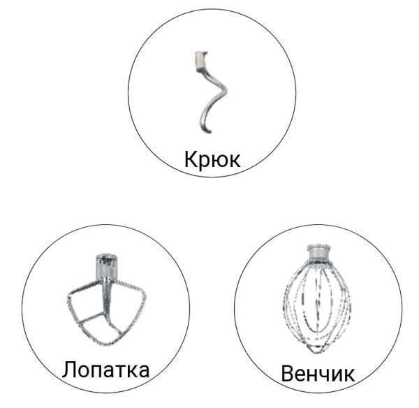 В комплекте: венчик, лопатка, крюк (нержавеющая сталь)
