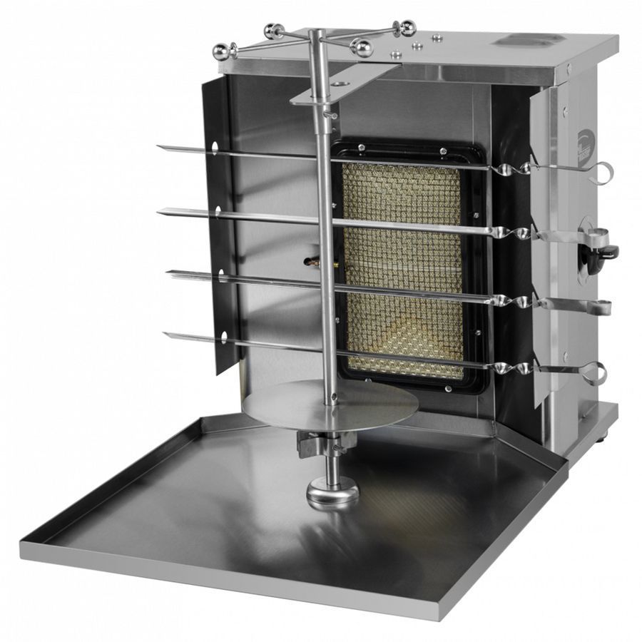 Гриль для шаурмы GRILL MASTER Ф1ШМГ применяется для приготовления шашлыка и мясной начинки для шаурмы. Работает от баллона со сжиженным газом по ГОСТ 20448, а также на природном газе с заменой сопла горелки и предназначена для использования на открытом воздухе или в помещении, при условии гарантированного проветривания или наличии вытяжной вентиляции. Производит обжарку мясного филе, подготовленного согласно соответствующей рецептуре и размещенного на вертикальный вертел, который вращается около газовой горелки до его готовности.
