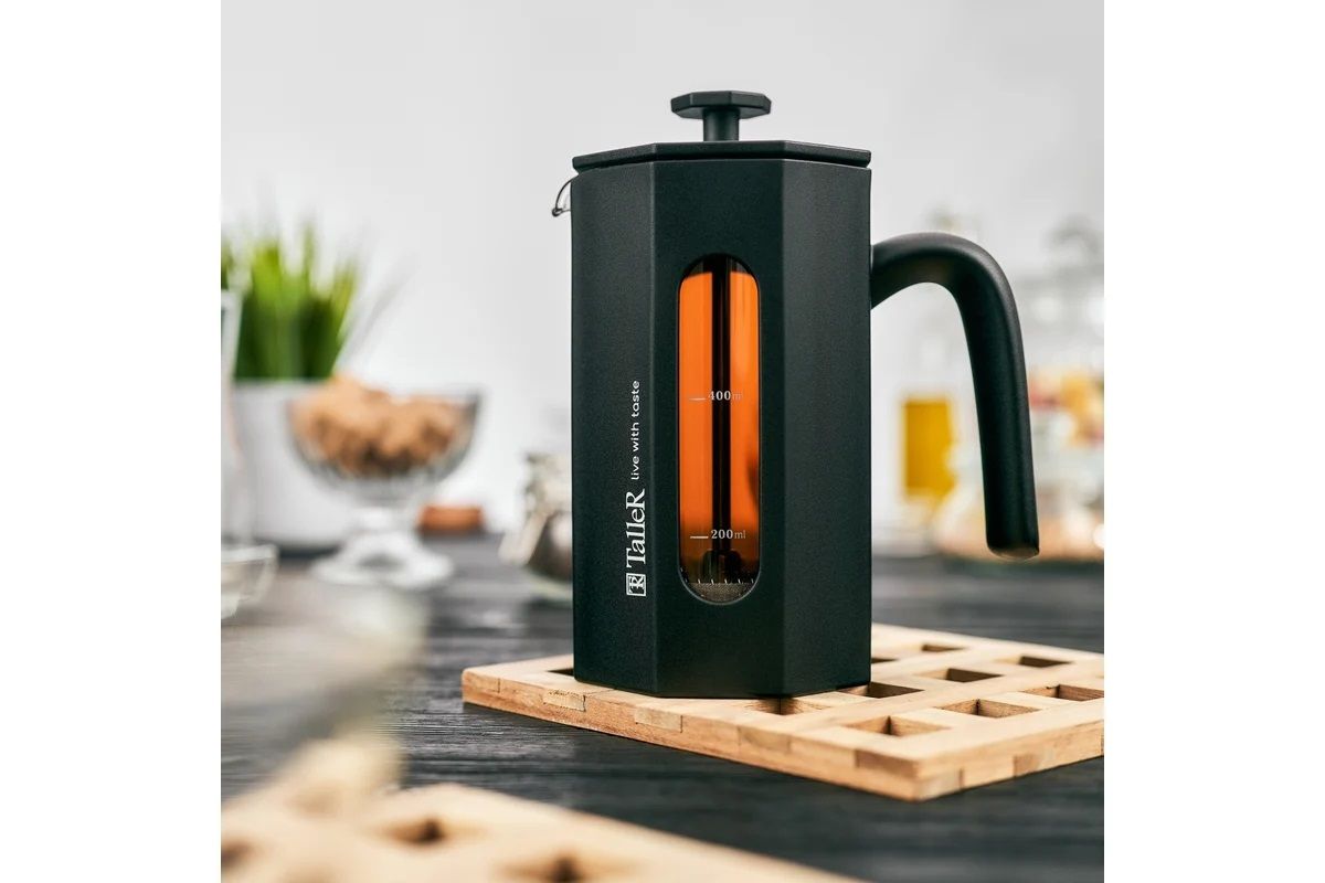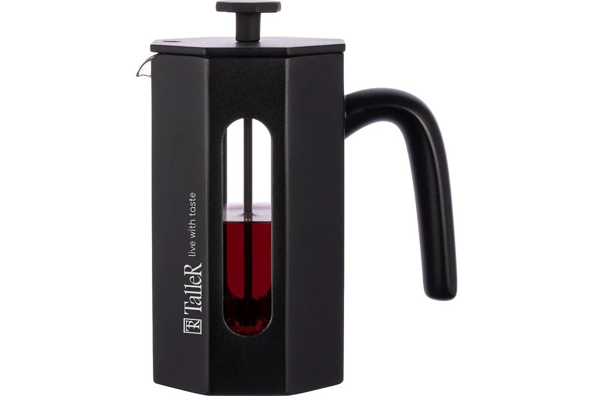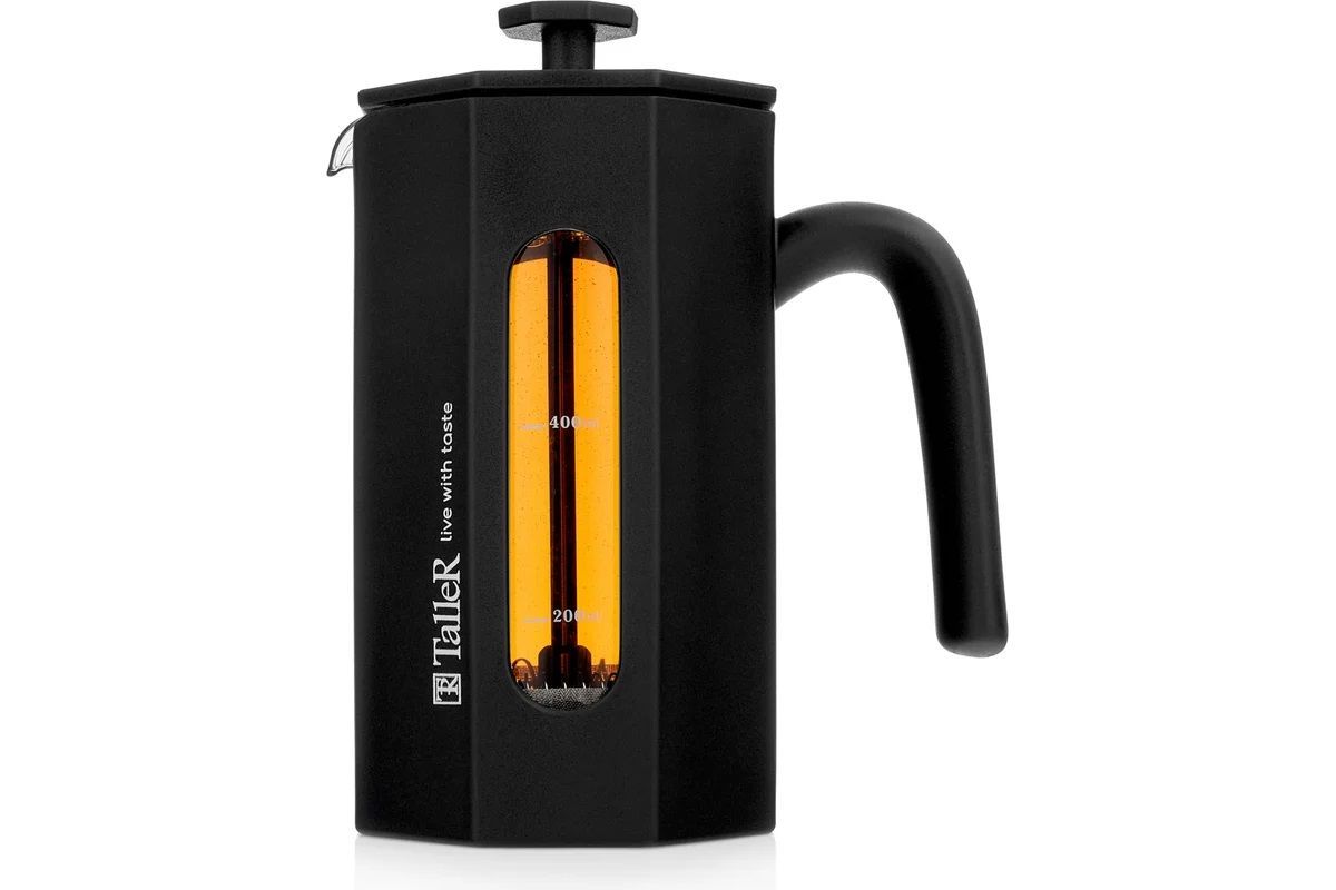 Френч-пресс 600 мл Taller TR-32339 идеален для приготовления кофе, чая, тонизирующих и расслабляющих напитков. Грани и идеально черный цвет корпуса чайника придают ему неповторимый вид. Разборная конструкция пресс-фильтра облегчает уход за изделием. Для сохранения наилучшего внешнего вида френч-пресса рекомендуется ручная мойка.