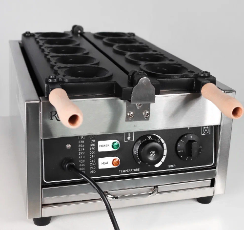 Вафельница HX-1105A — используется на предприятиях общественного питания и торговли для выпекания бельгийских вафель в форме тигровой головы. Модель оснащена электромеханическим управлением и поддоном. Позволяет одновременно выпекать до 5 изделий.