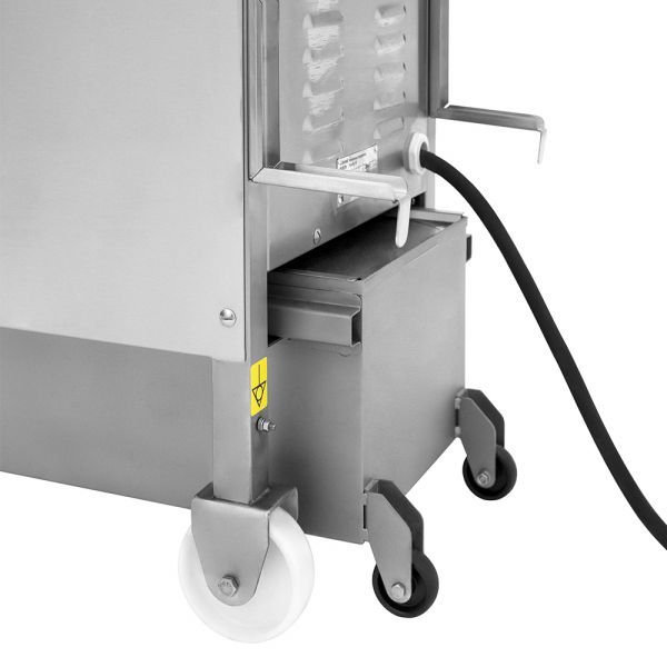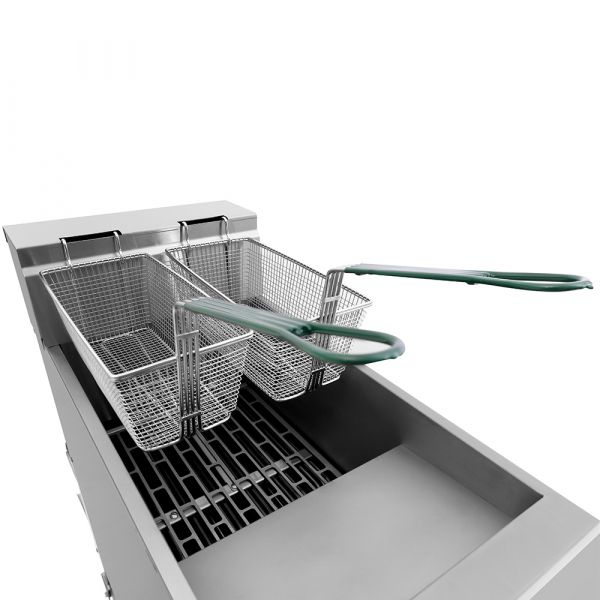 Фритюрница электрическая с системой фильтрации масла на закрытом стенде с одной ванной объёмом 25л. В комплекте две корзины из нержавеющей стали. В комплекте с фритюрницей поставляются 10 фильтров.