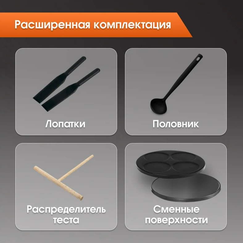 - Сменные поверхности – приготовление 1 или 4-х блинчиков одновременно