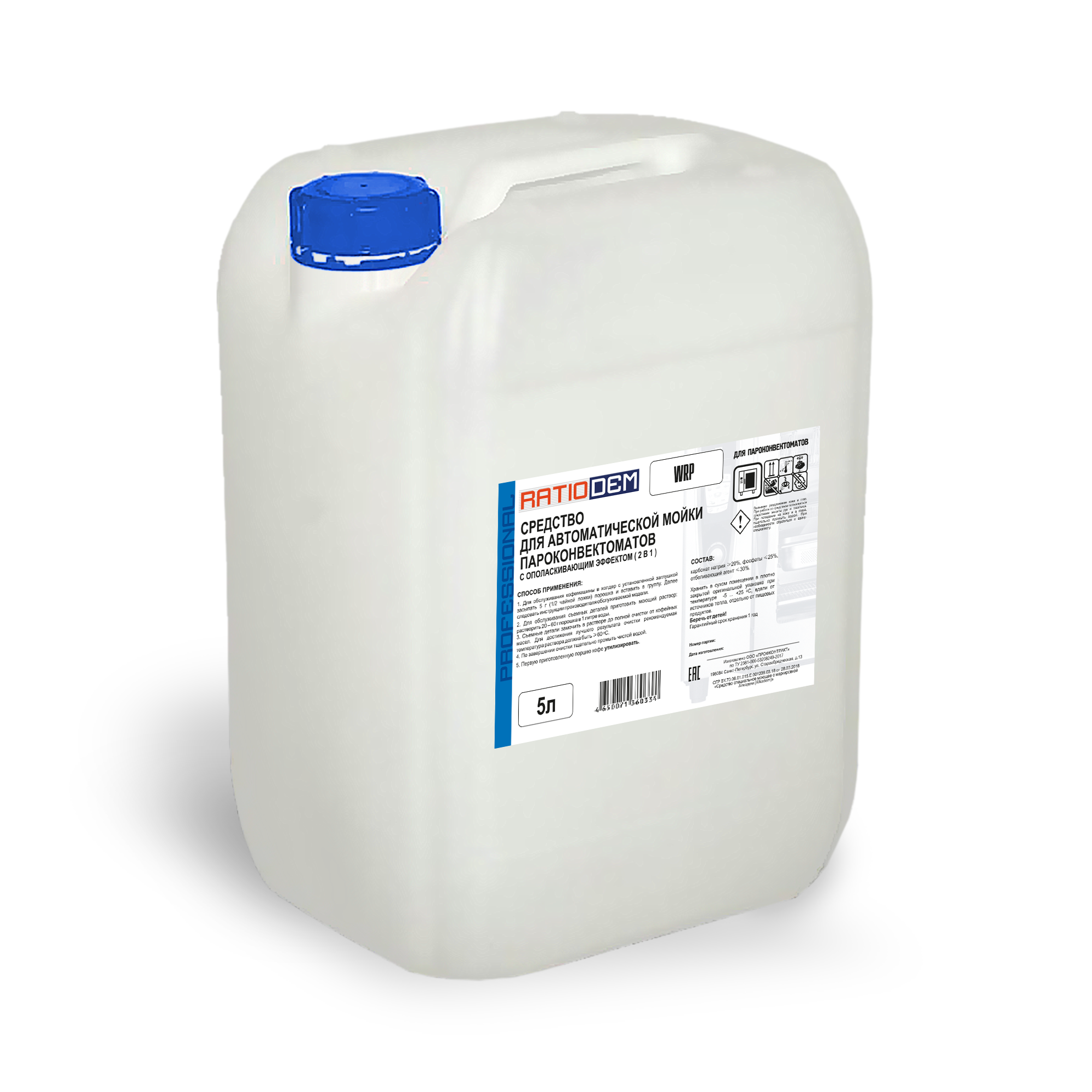Жидкое концентрированное щелочное моющее средство с ополаскивающим эффектом (2 в 1) RATIODEM WRP предназначено для автоматической и полуавтоматической очистки рабочей камеры пароконвектомата и аналогичного теплового оборудования.