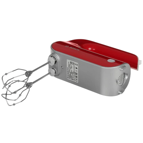 Миксер Bosch MFQ 40303 в корпусе красного цвета оборудован ручкой с прорезиненной вставкой для удобного захвата правой и левой ладонью. Повысить производительность прибора можно путем активации турборежима. Для взбивания различных ингредиентов предусмотрены венчики.