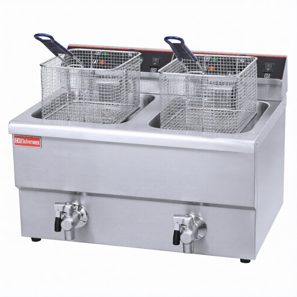 Настольная конструкция требует для своей установки минимум свободного рабочего пространства. Наличие двух рабочих емкостей существенно увеличивает производительность оборудования, а возможность автономной установки температуры нагрева масла дает возможность одновременно готовить как разные блюда, так и двойную порцию одного и того же продукта. Диапазон нагрева – от 50 до 200 градусов.