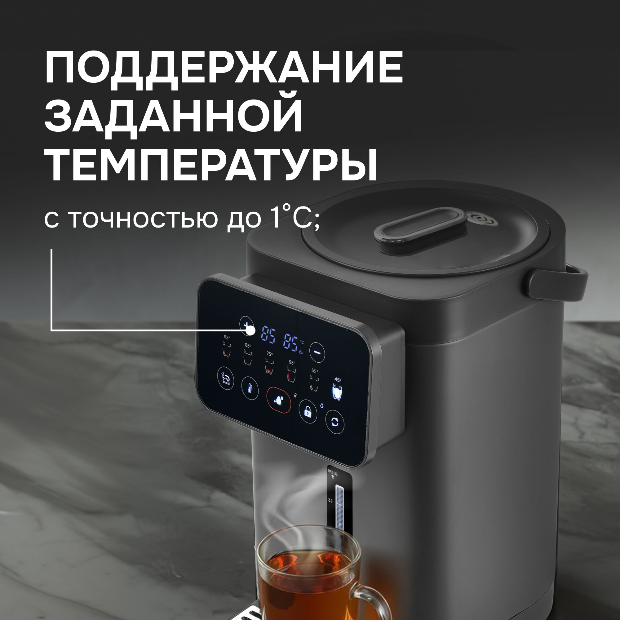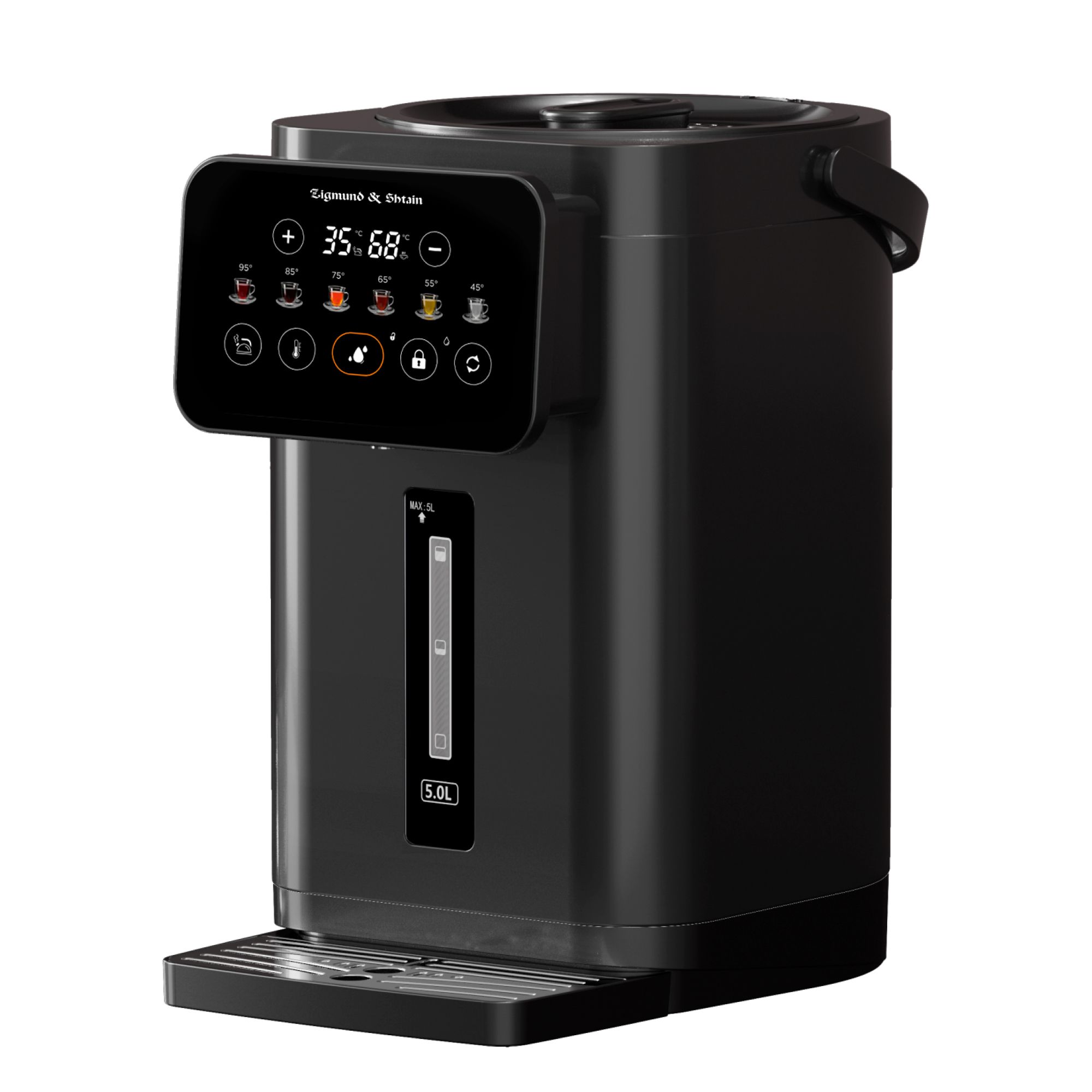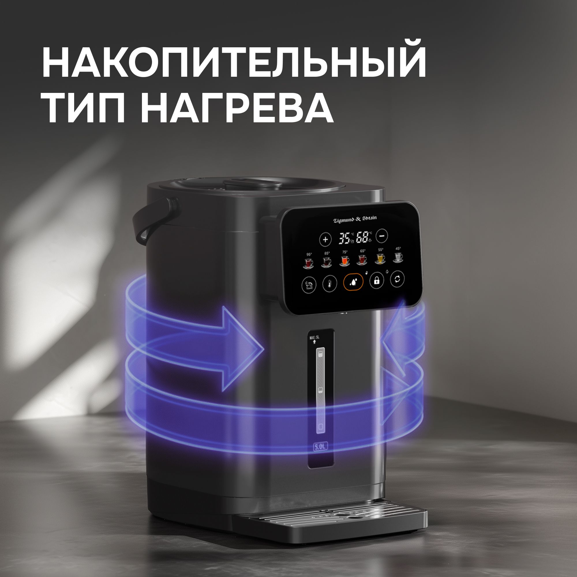 Термопот Zigmund & Shtain ZTP-950 – вместительный и функциональный прибор объемом 5 литров в стильном черном исполнении. Он обеспечивает поддержание заданной температуры в диапазоне от 35 до 95°С с 6 уровнями нагрева, что позволяет легко подобрать комфортный режим для любых нужд.