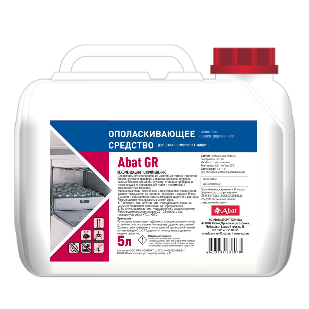 Жидкое кислотное ополаскивающее средство (5 л) Abat GR для стаканомоечных машин Abat GW предназначено для бережной обработки и регулярной очистки хрупкой посуды.